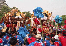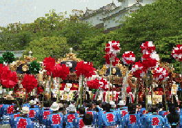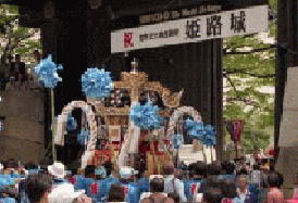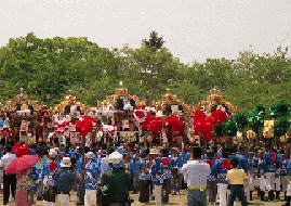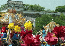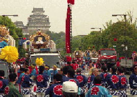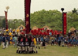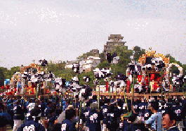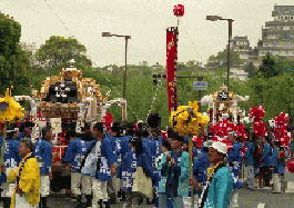 三の丸広場で横一列になって練り合わせながら北上する英賀神社の屋台