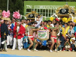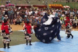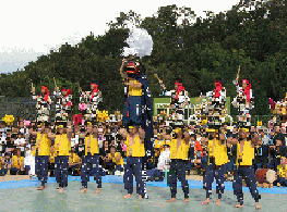 犬飼、土師の獅子舞と岩部の樽かきが披露され、4つのブロックに